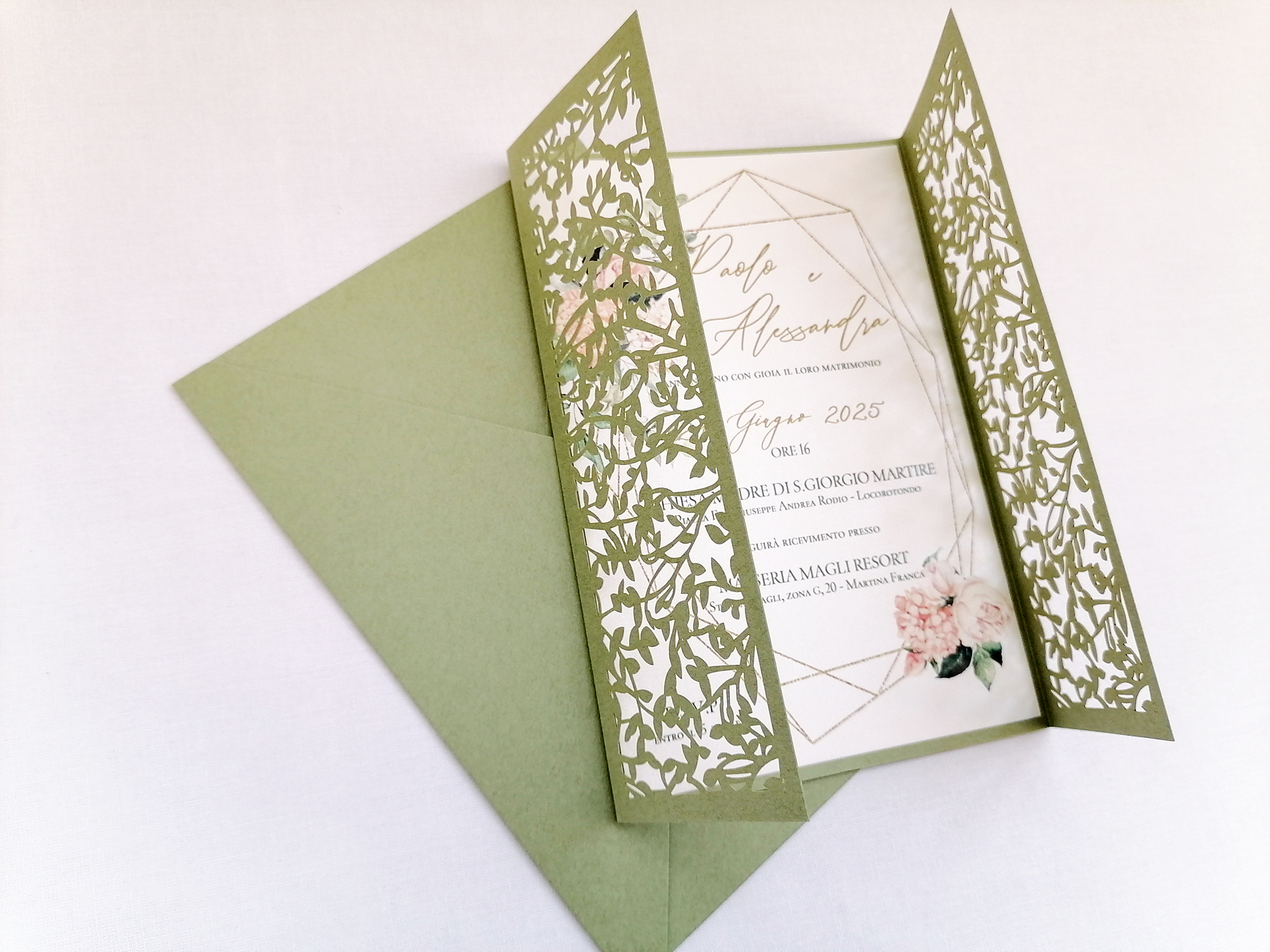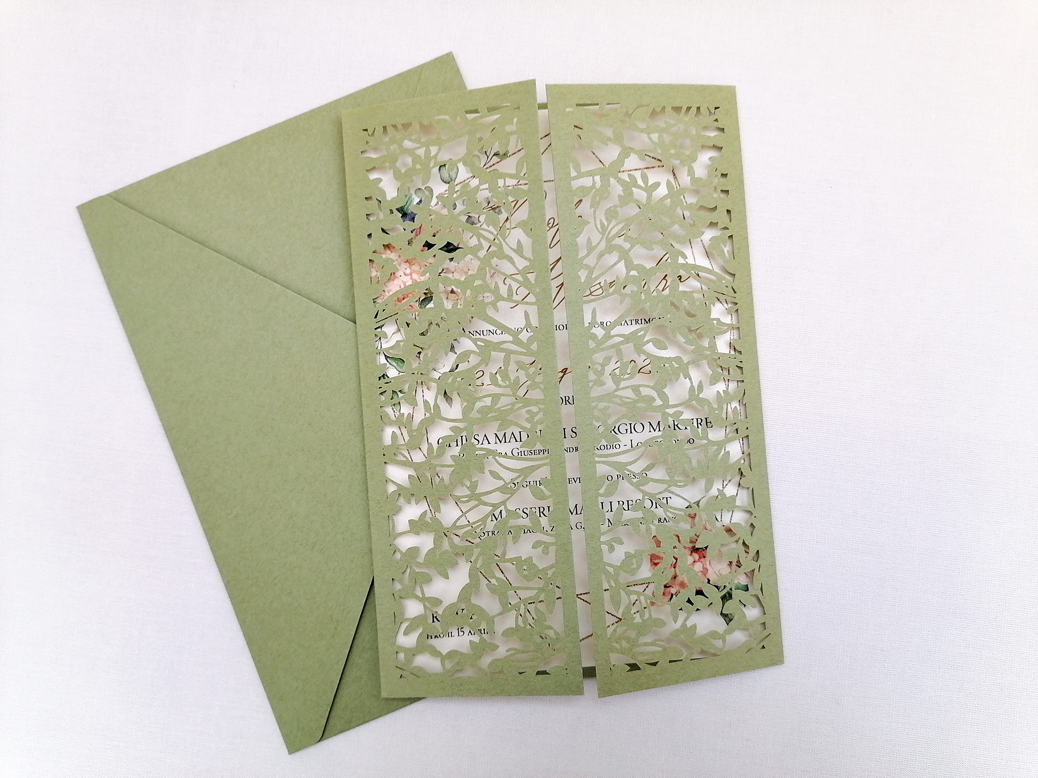 Elegante e raffinata partecipazione taglio laser per un effetto reale sorprendente e accattivante. Copertina ricamo 250gr. formato 12,7x18,5 cm. nel colore del vostro evento + partecipazione e invito interno in cartoncino bianco-latte finitura acquarello con leggera marcatura al tatto, spessore di pregio 300gr. della cartiera Fedrigoni di Fabriano. Prezzo completo di stampa e busta.