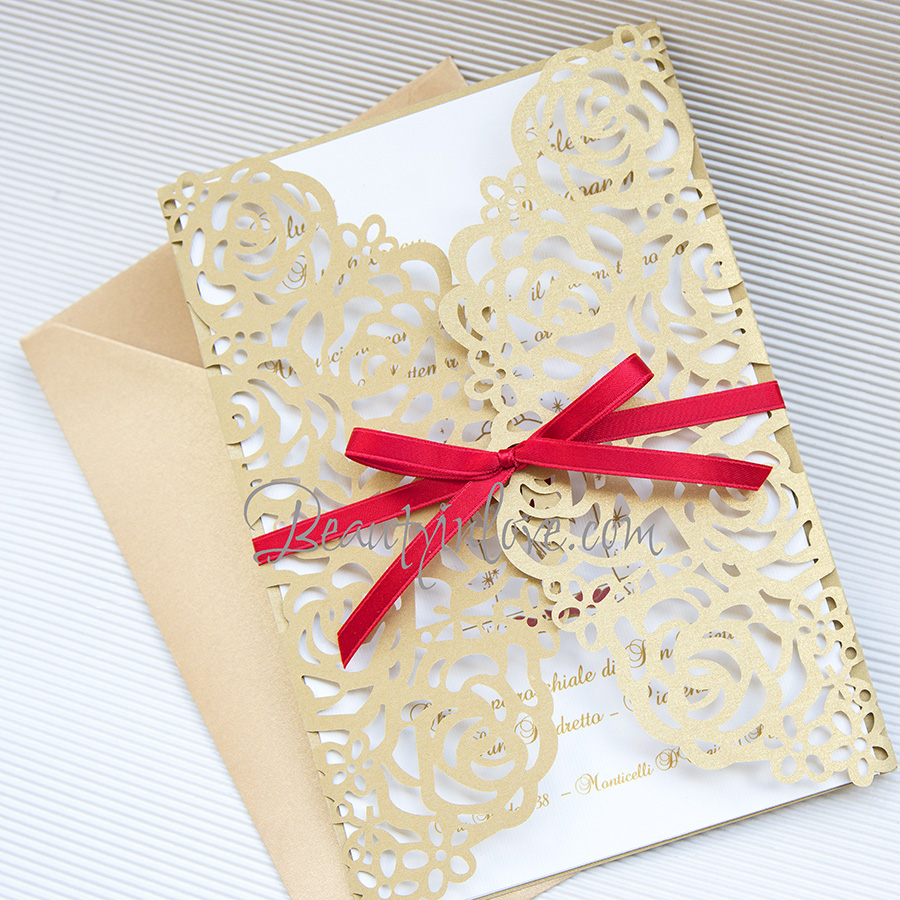 Elegante e raffinata partecipazione taglio laser per un effetto reale sorprendente e accattivante. Copertina ricamo 250gr. formato 12,7x18,5 cm. + partecipazione e invito interno in cartoncino bianco-latte finitura acquarello con leggera marcatura al tatto, spessore di pregio 300gr. della cartiera Fedrigoni di Fabriano. Prezzo completo di stampa e busta.