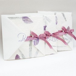 Elegante e raffinata partecipazione quadrata 15x15 cm. in fibra di cotone naturale bianco latte con inserti di fiori veri pressati nelle sfumature violacee + partecipazione e invito in cartoncino bianco-latte o country avana finitura acquarello con leggera marcatura al tatto, spessore di pregio 300gr. della cartiera Fedrigoni di Fabriano. Prezzo completo di stampa e busta.