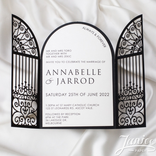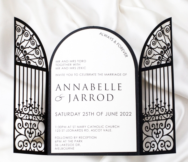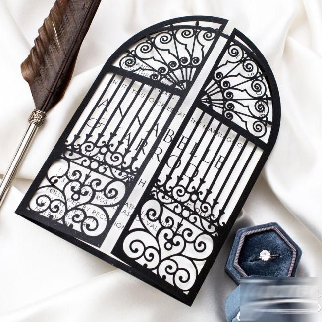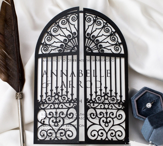 Elegante e raffinata partecipazione con grafica personalizzata dal particolare formato. Cartiera Fedrigoni di Fabriano 250gr in differenti colori sia mat opaco che perlato. Prezzo completo di stampa digitale e busta.