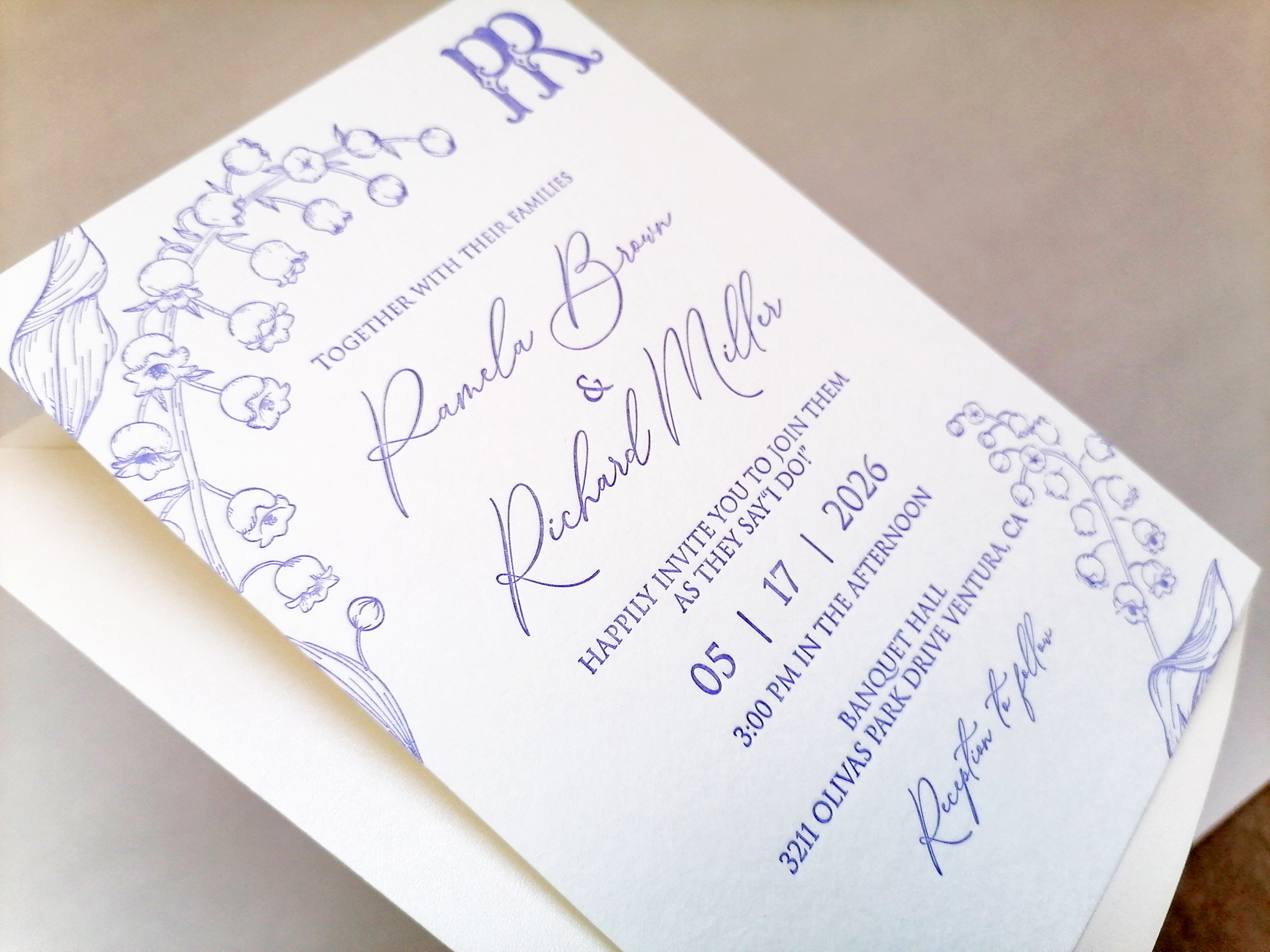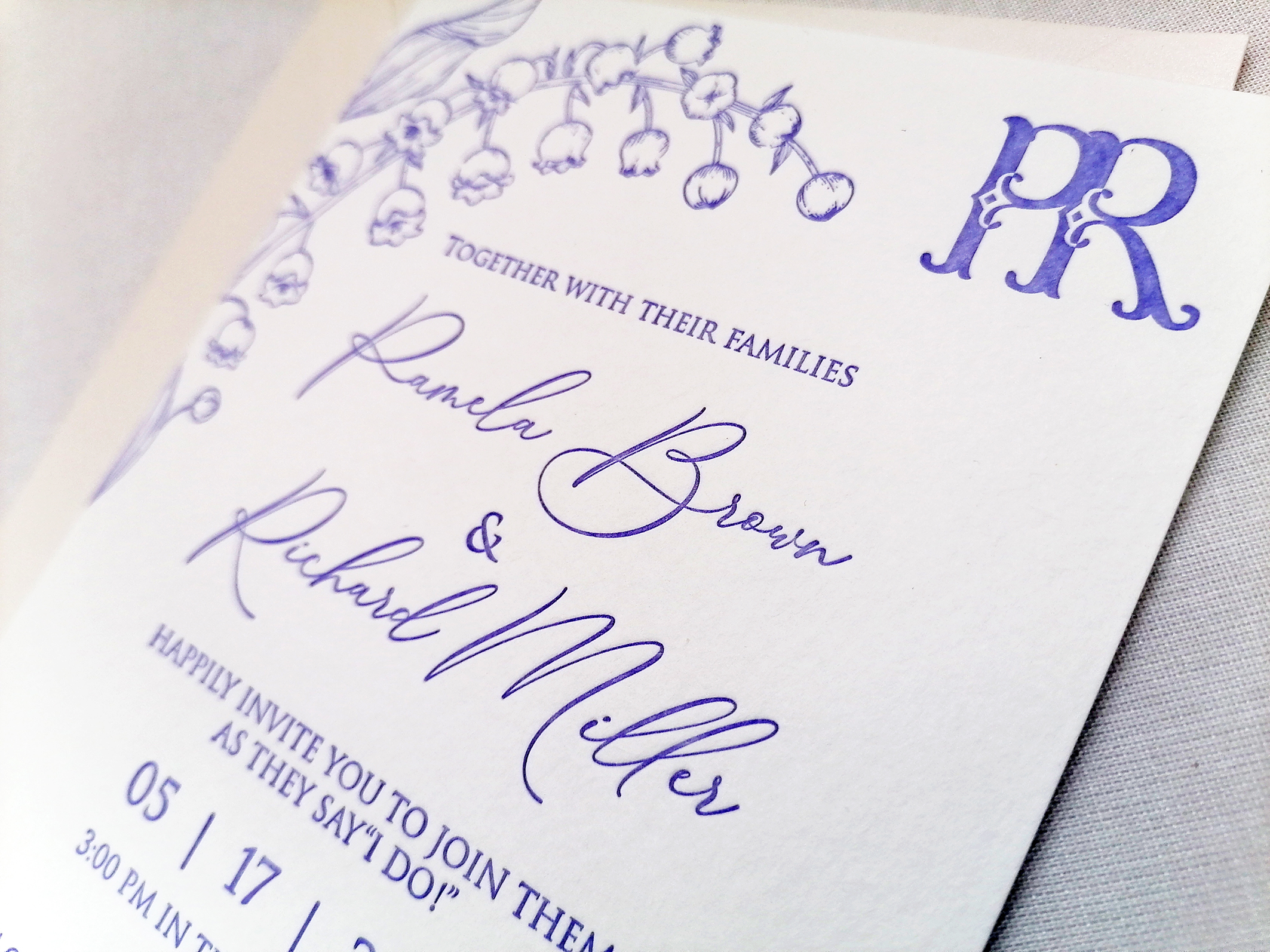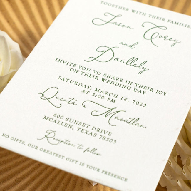 CARTONCINO IN FIBRA DI COTONE GRAMMATURA DI PREGIO 300 GR. con particolare stampa letterpress (unico biglietto con tutte le informazioni + busta)