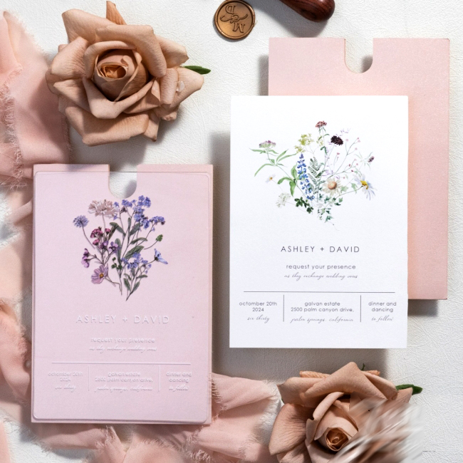 Elegante e raffinata partecipazione taglio laser per un effetto reale sorprendente e accattivante. Astuccio carta perlata con tasca ricamata 250gr. formato 12,7X18,5 cm. nel colore del vostro evento + partecipazione invito interno in cartoncino bianco-latte o country avana finitura acquarello con leggera marcatura al tatto, spessore di pregio 300gr. della cartiera Fedrigoni di Fabriano. Prezzo completo di stampa e busta.