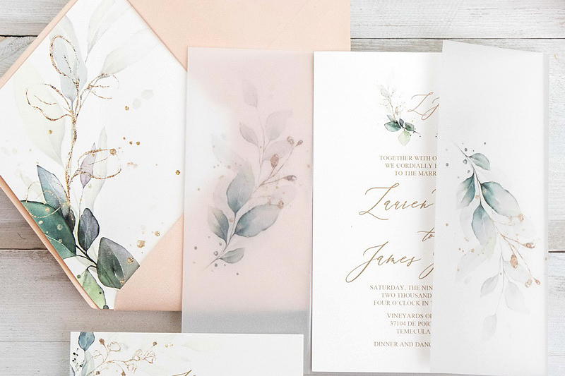 Elegante copertina traslucida effetto velato stampata. Partecipazione e invito interno in cartoncino spessore di pregio 250gr. della cartiera Fedrigoni di Fabriano. Prezzo completo di stampa e busta.