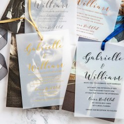 Elegante copertina traslucida effetto velato stampata con sottostante immagine. Partecipazione e invito in cartoncino spessore di pregio 250gr. della cartiera Fedrigoni di Fabriano. Prezzo completo di stampa e busta.