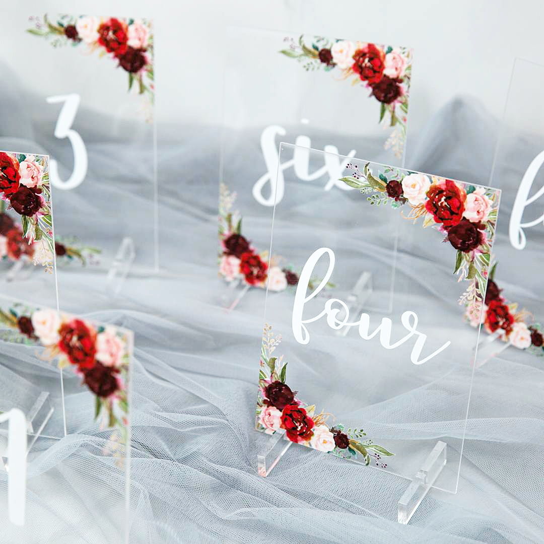 SEGNATAVOLI PLEXIGLASS SPESSORE 2mm. RETTANGOLARE (12,7x17,8 cm. ) O QUADRATO (15x15 cm.) STAMPATO CON GRAFICA COORDINATA DELL'EVENTO. SUPPORTI NON COMPRESI.